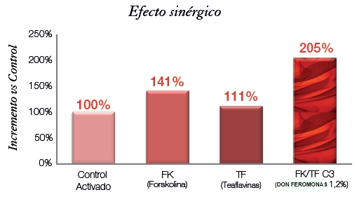 La complementación de acciones de la forskolina y las teaflavinas permite conseguir un efecto de potenciación sinérgico.