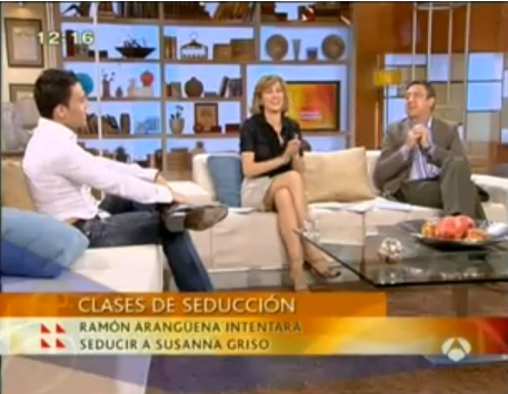 En Antena 3 televisión, Susana Griso y Ramón Aranguena toman clases de seducción de la mano de Mario Luna, autor de Sex Code y Valerie Tasso, autora de Diario de una ninfómana. Para ver CLICA AQUI. |